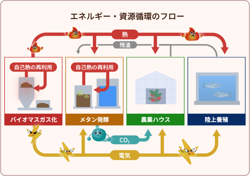 ガス化設備からの排熱を温水に変えてメタン発酵設備、陸上養殖、農業ハウスで利用します。ガス化設備で発電した電気は敷地内で利用します。農業ハウスの廃棄トマトや葉等はメタン発酵の原料として利用します。メタン発酵設備で回収したCO₂は農業ハウスで利用します。