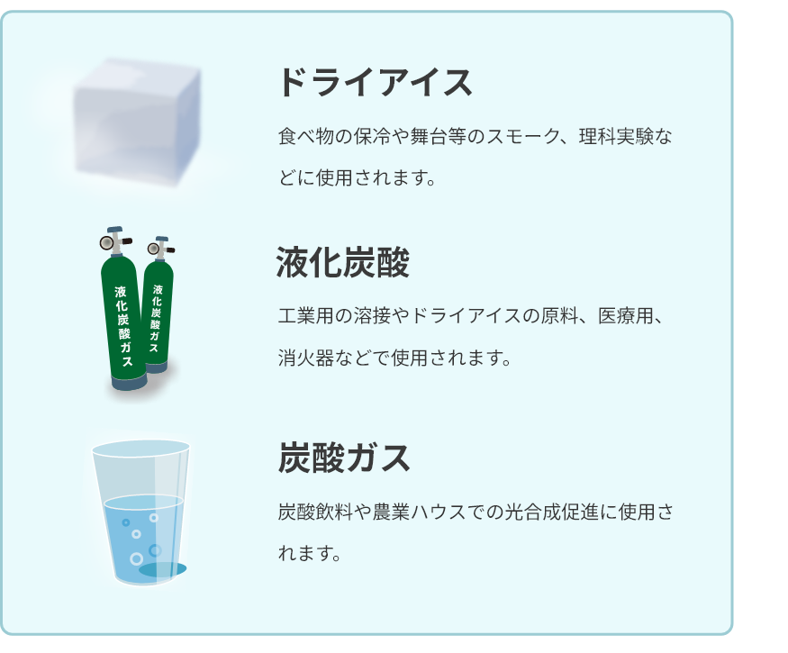 排気ガス中のCO₂を回収します。 廃棄ガスからCO₂を回収し、液化炭酸やドライアイスを製造します。本施設ではバイオマスガス化施設の排気ガスからドライアイスペレットを製造し、施設内外で利用します。